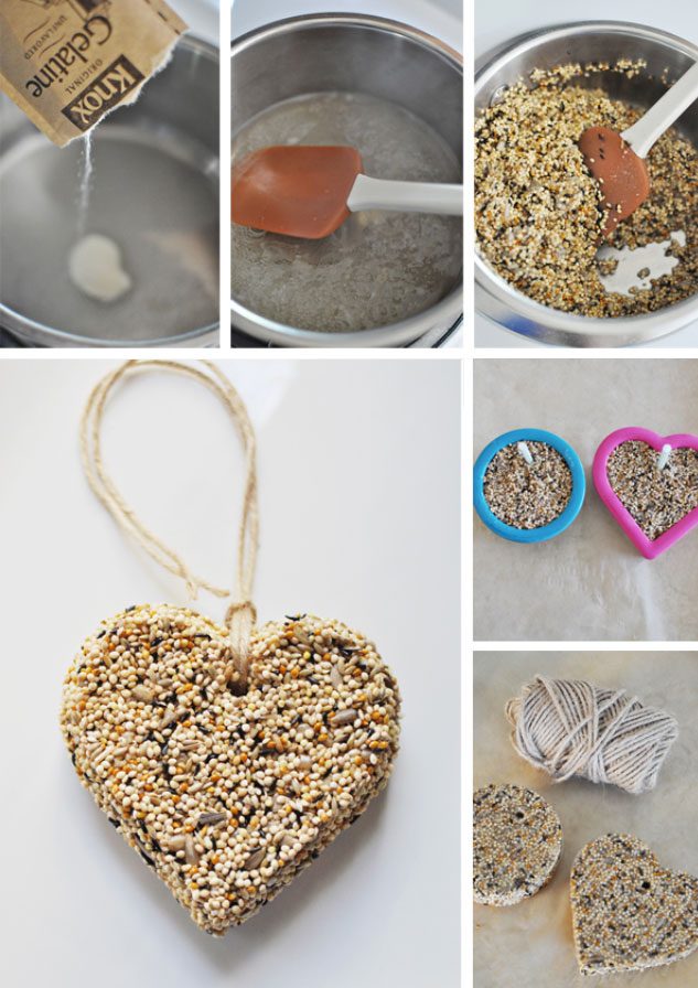 Такую кормушку можно изготовить из различных злаковых и желатина. Для этого вам понадобиться желатин, который нужно растворить на водяной бане, насыпать в него зерно, чтобы получилась густая масса, разложить по формочкам (можно использовать небольшие формы для выпечки или подсвечники), не забыв положить туда и нитки, за которые можно будет подвесить кормушку к дереву, и отправить в холодильник для застывания. Для удобства, можно также сделать небольшое отверстие в приготовленной массе, через которое будет продеваться нитка для подвешивания кормушки.