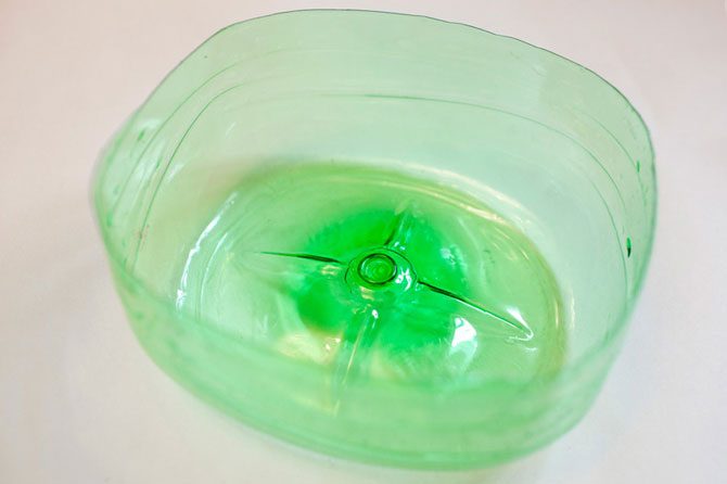 Отрезаем низ пластиковой бутылки, это будет основа для нашей будущей кормушки. Конечно, можно сделать кормушки и меньшего размера — они будут легче по весу и можно будет без труда закрепить их на ветвях деревьев.