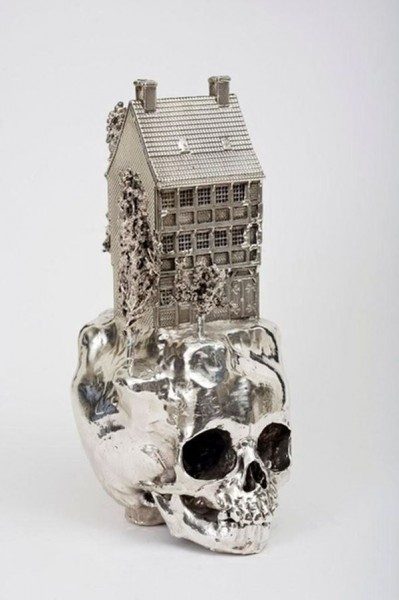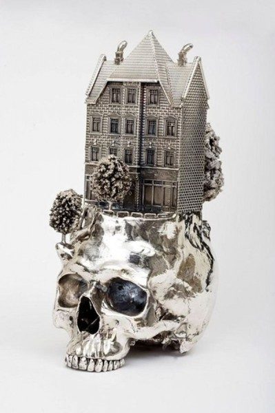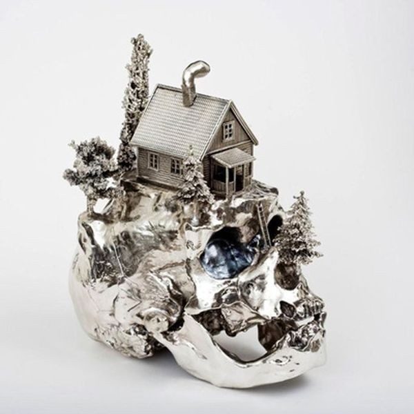 На черепушках «вырастают» домики, фургончики, пейзажи, маяки. Не смотря на мрачность, работы художника необычайно красивы. Материалом как правило служат сплавы золота, серебра или бронзы.