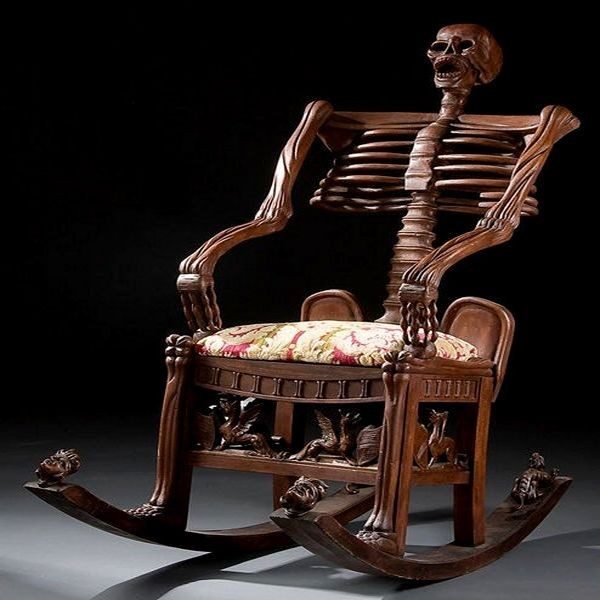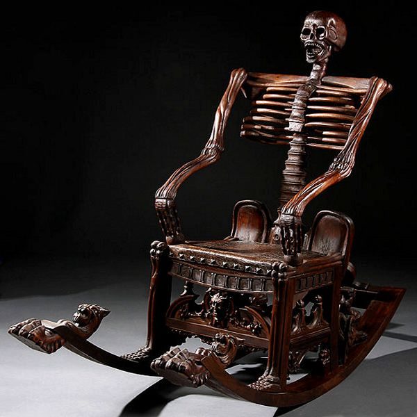 Там-то уж точно не испугаются ухмыляющегося черепа, торчащих костей и прочих элементов, связанных с мистикой и прочими жуткостями. Отдельного внимания заслуживают резные фигурки, укращающие нижнюю часть кресла. Гаргульи, демоны, головы животных с навевающими ужас оскалами, — все это никак не вяжется с уютом и умиротворением.