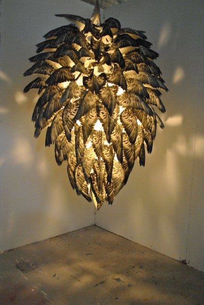 Под воздействием этой темы она создала люстру под названием «Крылья», которые представляют собой шелкотрафаретные отпечатки крыльев на бумаге. Такая люстра дарит ощущение природы в доме.