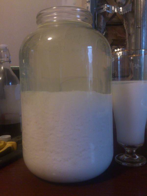 Пропорция – 1 стакан молока на литр продукта. Молоко впитывает в себя всю гадость и оседает в виде хлопьев (из за этого градус продукта понижается). После чего сливаем максимально отсекая хлопья.