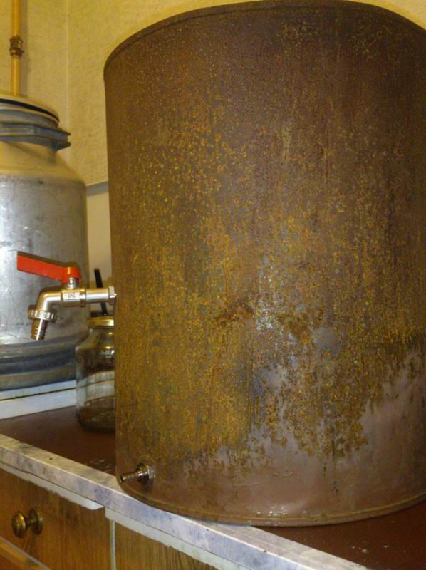В него влезает 50 литров холодной воды, которой хватает на выгон 40 литров браги. Но на всякий случай сделан сливной кран посередине бочки, так как вода нагревается сверху и сливать нижнюю часть смысла нет.