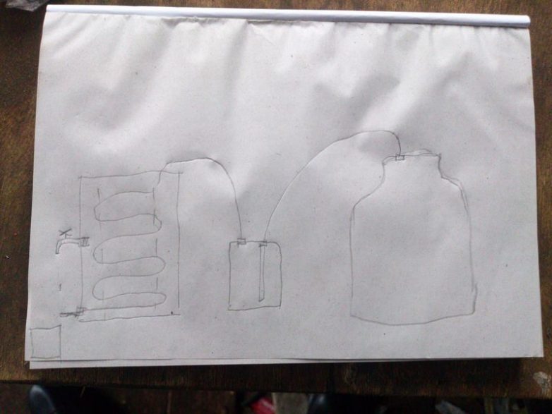Схема самогонного аппарата. Справа налево: ёмкость в которой будем варить самогон, сухопарник, холодильник со змеевиком.