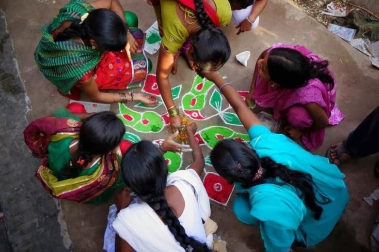 16. В домах отводят специальную комнату для совершения обряда «пуджи» — благодарственной молитвы. У каждой пуджи свой узор ранголи на полу.