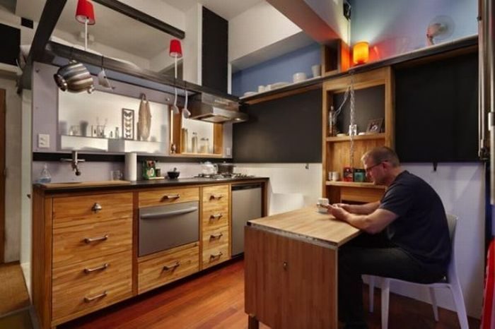 И не только представил, но и воплотил свою идею в жизнь. В крошечной квартирке есть зал, спальня, кабинет, кухня и санузел!