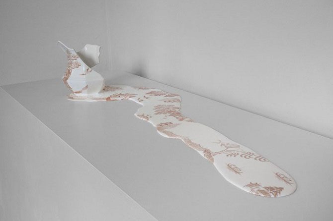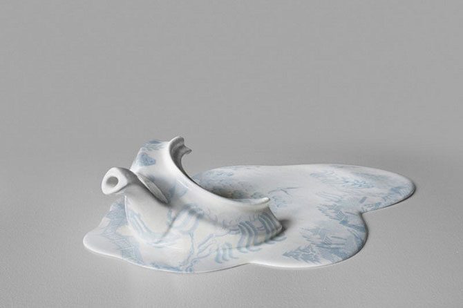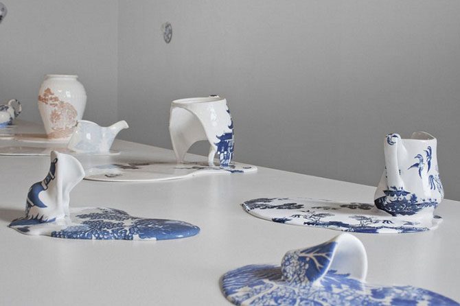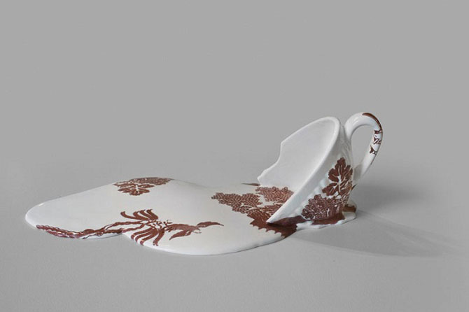 Этот вопрос можно задать художнице Ливии Марин (Livia Marin), которая создала целую коллекцию расплавленной посуды. Причем фарфоровые лужи украшены красочным рисунком, что подчёркивает необычность экспонатов.