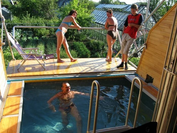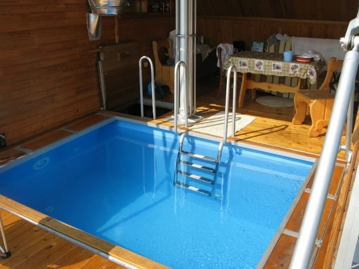 Смотрим далее креативную баню инженера с бассейном и местом для отдыха.
