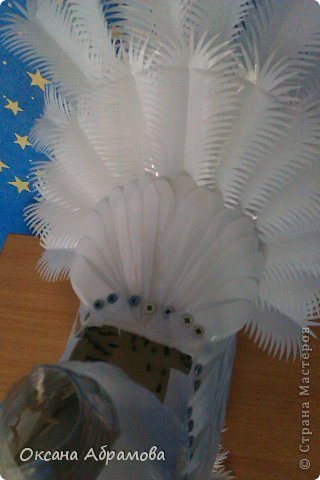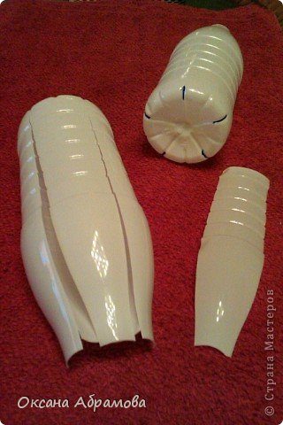 Из верхних частей бутылки нарезаем перья.
