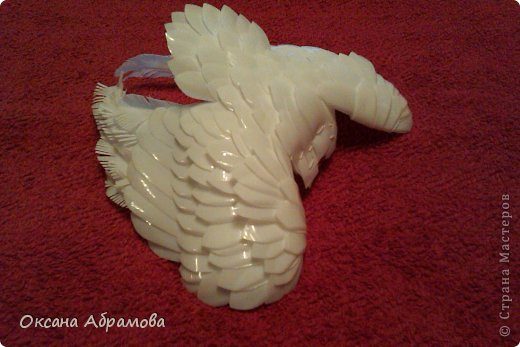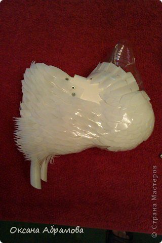 Из верхней части бутылки нарезаем длинные, маховые перья для крыльев.