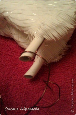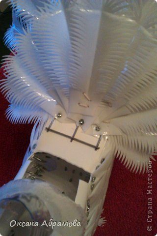Снимаем горловину и начинаем закрывать ее перьями с помощью проволоки, примерно, чуть ниже середины.