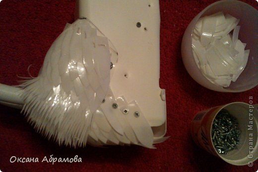 Готовые крылья прикрепляем к канистре с помощью саморезов ( не менее 3-4 см длиной) по бокам, аккуратно подлезая под перышки, чтобы потом крепление не было заметно.