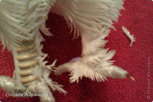 Следующим этапом, начинаем закрывать бока канистры снизу, чтобы перья, как бы выходили из под пушистой части «ляжечки».