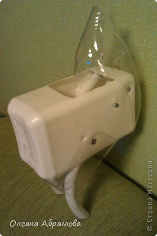 Из верхней части 1,5л. прозрачной бутылки формируем горловину: отрезаем примерно чуть меньше половины бутылки, разрезаем ее и складываем конусом, скрепляем с помощью проволоки. Если конус, вам покажется узковат сзади, расширьте его, вставив небольшой треугольный кусочек.