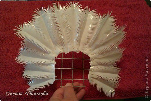 С помощью проволоки, начинаем крепить перышки к сетке.