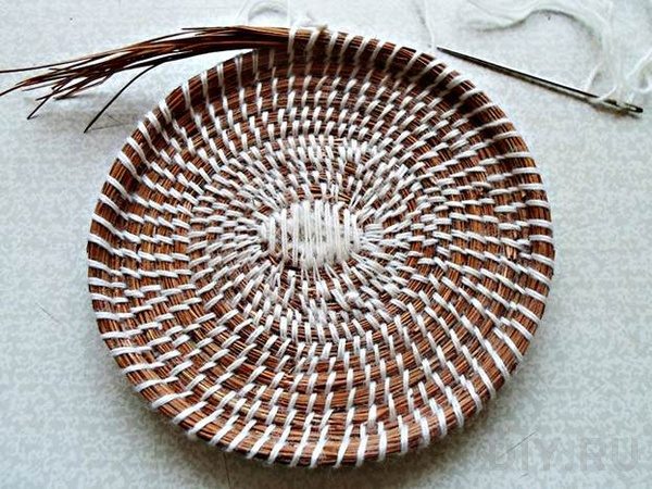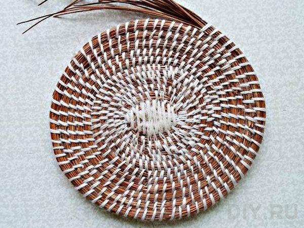 Диаметр основы зависит от того, какое изделие вы планируете сделать. Когда она будет достаточно большой, можно переходить к изготовлению стенок. Для этого следующий ряд плетение немного приподнимите над основой, так работа будет проходить одновременно по кругу и немного вверх с каждым новым рядом.