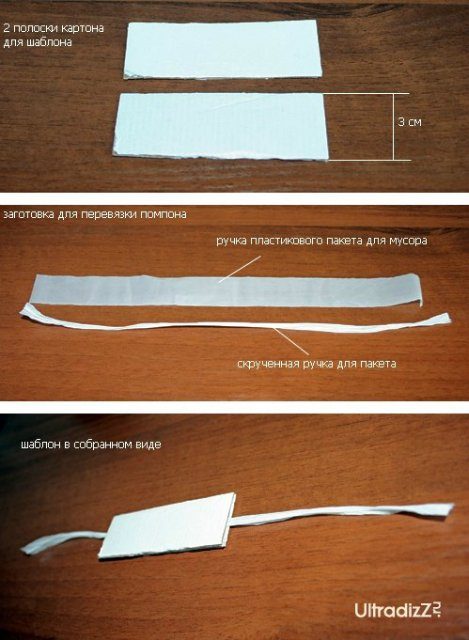 Для начала делаем помпоны. Ширина картонки-основы для помпона -3см., поэтому помпоны получились в диаметре 6 см.