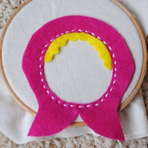 Ткань для лица натягиваем на пяльцах, прикалываем булавками лицевую часть косынки и пришиваем белыми нитками по внутреннему контуру швом «вперед иголкой».