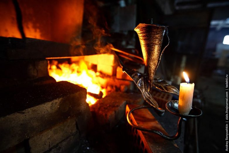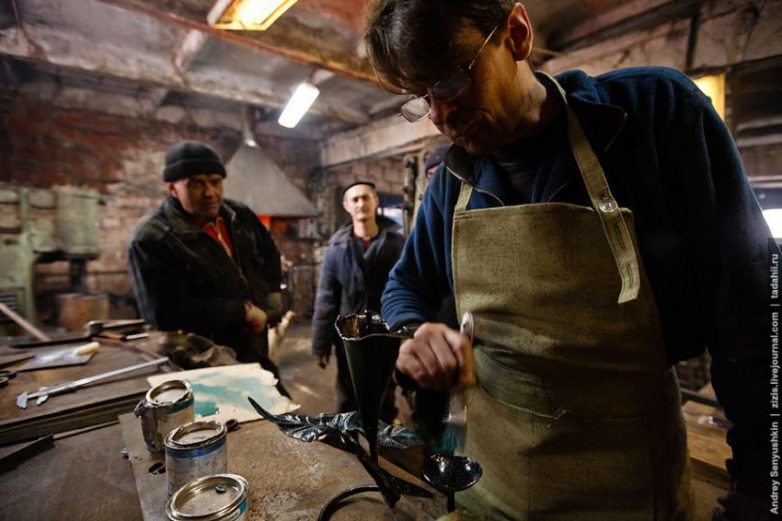 На заключительном этапе кузнец Юрий превращается в художника-оформителя. Патиной и практически сухой кистью наносятся зеленые, золотые и серебряные слои. Тут же собираются зрители