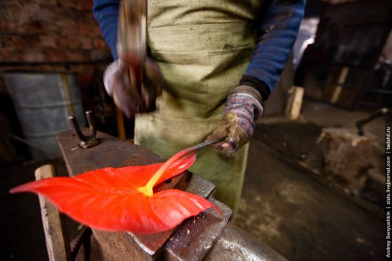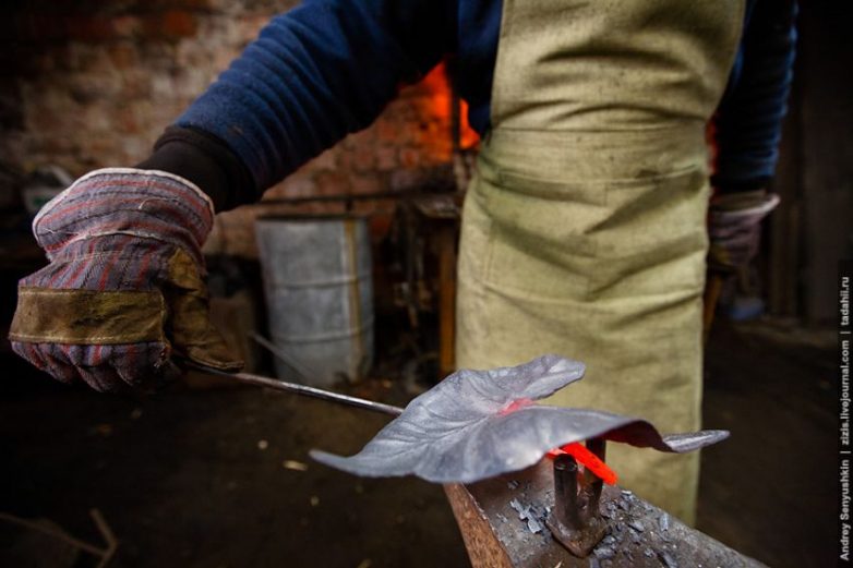 Пока будущий лист раскален и податлив, ему придается изогнутая форма. Насколько похожим получится сделать кусок металла на настоящий лист зависит от мастерства кузнеца.