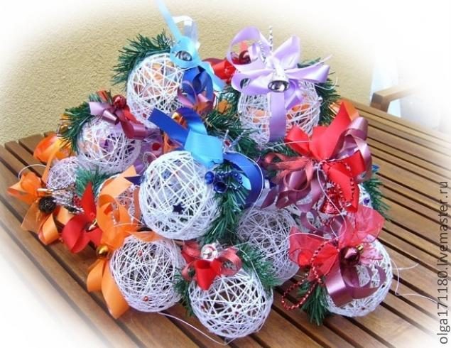 Чтобы поверхность шара получилась фактурной можно, обмазав шары клеем, обвалять их в крупе, например, в пшене или в зернах кофе.