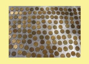 Прежде всего, нужно приготовить исходный материал – большое количество монет. Это могут быть как настоящие копейки любого номинала (и желательно одного размера), так и декоративные монеты, которые можно купить в магазинах для творчества. Последние обойдутся вам дешевле; кроме того, они уже имеют отверстия, а в процессе подготовки обычных монет вам придется просверлить их самостоятельно. Поскольку монетки часто бывают потертыми, лучше окрасить их золотой краской из баллончика. Благодаря этому они приобретут красивый блеск и будут одного оттенка.