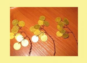 Используя проволоку средней толщины, скручиваем вот такие веточки – на каждой из них должно быть по три денежных «листика». Можно прикрепить и больше монет к каждой веточке, но тогда и проволоку берите чуть толще, чтобы она не прогибалась. Три маленькие веточки объединяем в одну большую. Старайтесь, чтобы монеты были развернуты на одну сторону – так будет легче сформировать крону.