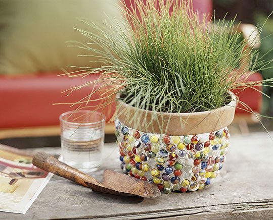 Декоративные шарики и плиточный клей помогут преобразить любой цветочный горшок!