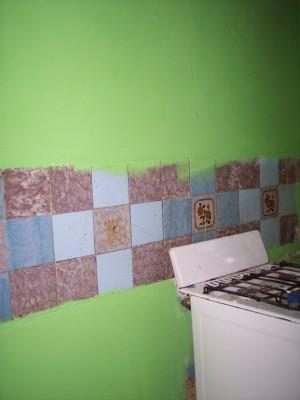Для начала снимаем все пошлые наклейки с плитки, оставшиеся со времен прежних хозяев.