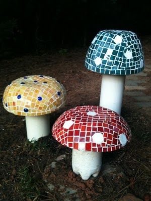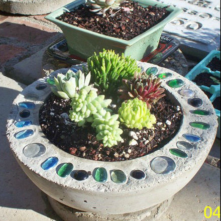 Пока раствор полностью не встал- можно его верхний срез инкрустировать всевозможным стеклярусом и камушками или кусочками битого кафеля.