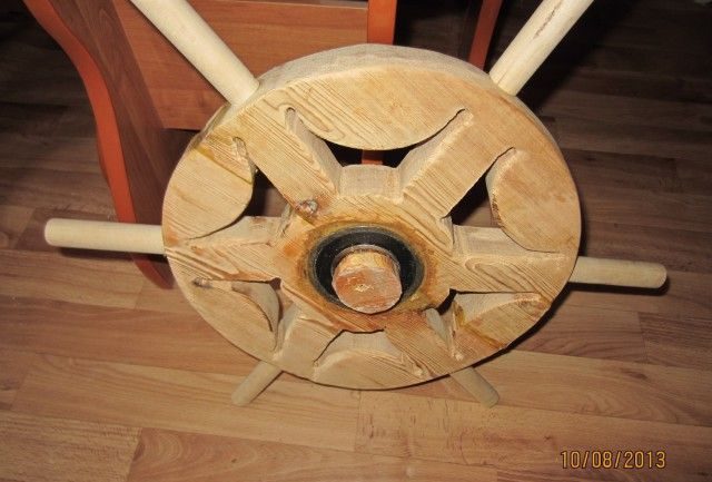 В качестве ручек на штурвал, хотел найти деревянные ручки для напильников, но увы, побродив по магазинам нашел лишь пластиковые, меня это не устраивало, нашел выход, купил черенок для метлы, напилил куски нужной длины, сточил немного для плотного входа в штурвал. шлифовка.