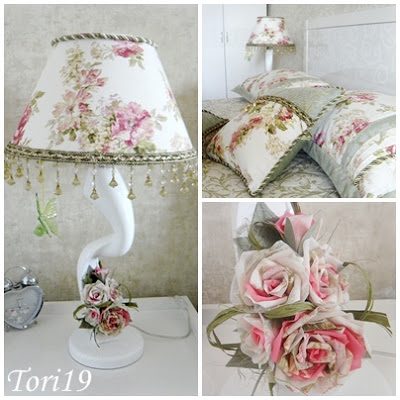 Я подбирала для изготовления цветов ткани, подходящие по цвету к текстильному оформлению спальни дочки. И так как абажур одной лампы уже был заменен мной полностью…