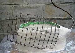 Делаем хвостик Лебедя Оставьте голову в покое, сделав для нее подпорку из подручного материала. Часа два необходимо, что бы она схватилась и приобрела нужную жесткость. А тем временем мы займемся хвостиком. Для этого кусочек сетки изгибаем под углом в 45 градусов и с помощью раствора фиксируем его к корпусу лебедя…