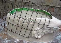 Следующий этап – создание крыльев. Для этого необходима кладочная сетка размером 15 на 30 сантиметров. Вдавливаем ее немного наискосок внутрь раствора. Изогните слегка ее, что бы в дальнейшем крылья получились более естественные…