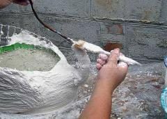 Затем нам необходимо промазать все основание нашего лебедя. Для этого по всей боковой площади лебеды наносим слой раствора толщиной примерно 2 сантиметра. И корректируем работу шпателем и мокрой кисточкой…