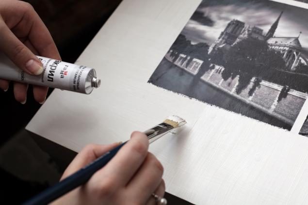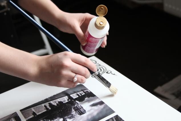 5. Аккуратно скатываем верхний слой бумаги, стараясь не повредить иллюстрацию. После этого, аккуратно наносим кистью на поверхность бумаги клей ПВА.