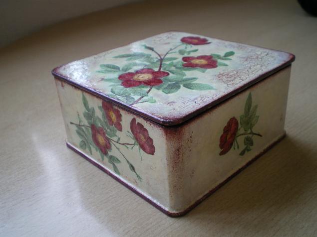 4. Пока сохнет крышка, начинаем работу с оформлением «тела» коробочки. Подбираем подходящий цвет, наносим так, что бы переходы от салфетки к поверхности были не заметны. И… правильно! шкурим!!! мелкой шкуркой, нежно и бережно, что б не содрать салфетку и краску. После ошкуривания подмалевываем те места, кторые оголились. Подмалевываем, шкурим. Даже там, где салфетка облезла, — не страшно, нам нужен эффект старины, мы его добьемся. А вот лишние волны и заломы уйдут.