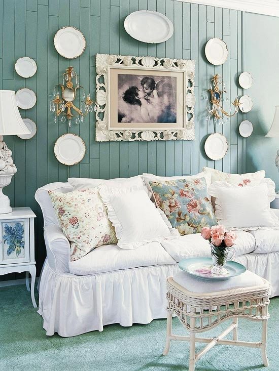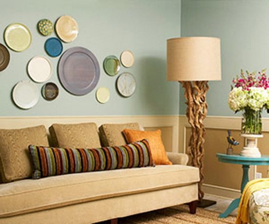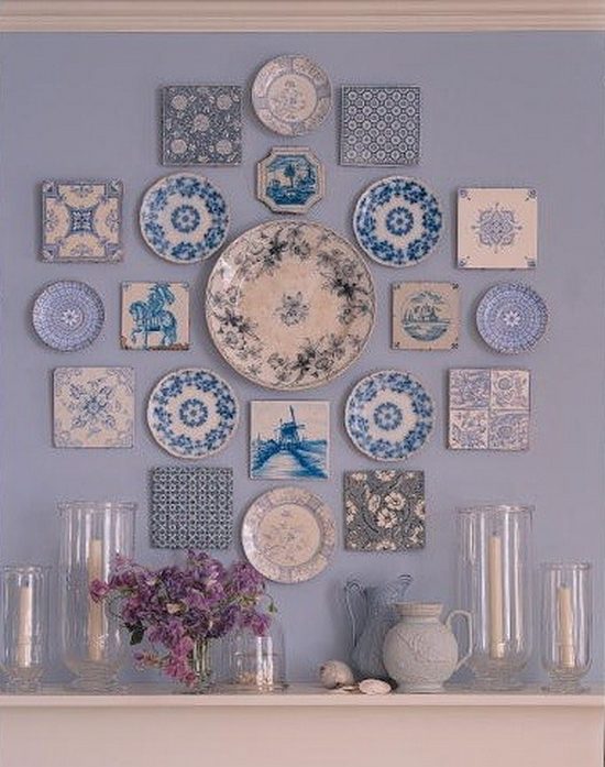 Тарелки на стене могут украшать не только стены в кухне — это отличный дизайн для холла и гостиной комнаты. Их можно закреплять непосредственно на самой стене, при помощи шурупов и отверстий, а также можно красиво расположить их на полочке или нише в стене. Предпочтение следует отдать тарелкам необычной формы.