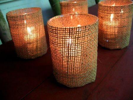 Мешковиной можно декорировать свечи или стаканчики-подсвечники.