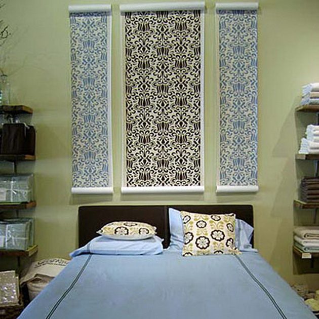 Выход: на стену над кроватью крепим декоративный карниз или штангу. Шьем плоские или пышные подушки (на свой вкус) в количестве 2-4 штук. Желательно сделать на них съемные наволочки. Крепим подушки на карниз при помощи завязок, пришитых к наволочке, или петель. По желанию можно сшить несколько сменных комплектов наволочек, например, в тон постельному белью или покрывалу.