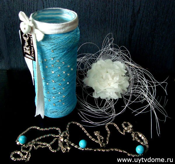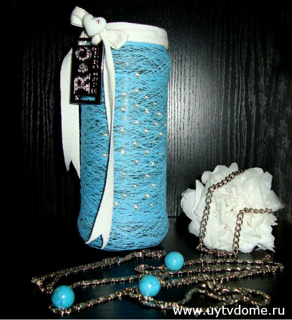 В результате у нас получилась небольшая, эксклюзивная, голубая вазочка (20 см в высоту), декорированная нитками и дополненная стразами, которая чудесно дополняет интерьер, даря тепло и положительные эмоции!