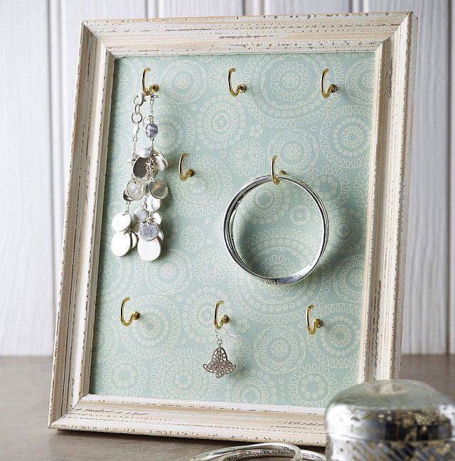 Эта группа подставок понравится девушкам творческим, которые любят делать всевозможные поделки своими руками. Вариантов создания подставок множество, но самым простым и доступным в исполнении является вариант с картинной рамой и сеткой. Вы просто берете сетку, или же кружево, накладываете его на картон или фанеру, плотно натягиваете, как холст, и прибиваете к рамке. И органайзер для украшений готов — любая дырочка в сетке — это отверстие для хранения серёжек.