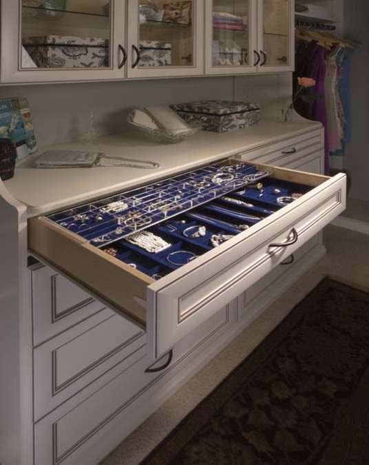 Такой же принцип организации, что и в вертикальных шкафах, но перенесён в горизонтальную плоскость. Вы можете заранее спроектировать внутренние ящики для бижутерии или же купить в магазине подходящие органайзеры для разных украшений и разложить в произвольном порядке. Также, можно заказать ящики со встроенными пластиковыми или деревянными ограничителями, предварительно рассчитав необходимое место под украшения.