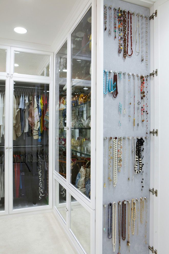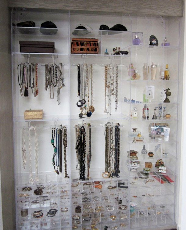 Это, пожалуй, самый дорогой и роскошный способ хранения бижутерии и украшений, и одновременно — самый удобный. Ведь в таком случае абсолютно все вещи находятся на виду, у каждой пары серёжек есть своя ячейка, а также они защищены от пыли и грязи.