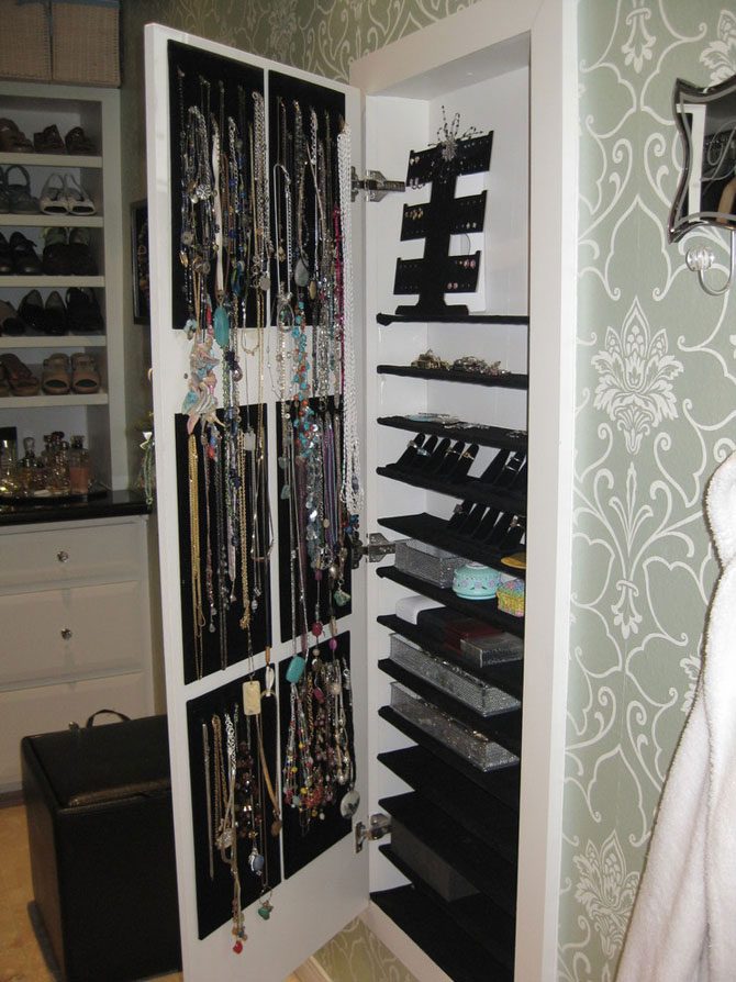 Способы организации украшений уже в самом шкафу могут быть самыми разными — от обычных ячеек, до плоских подставок с валиками и мягких «поролоновых пальцев» для колец. Есть ещё варианты открытых шкафов — вытянутая череда маленьких полок и ячеек без дверцы. Тоже удобно, но не защищает от пыли.