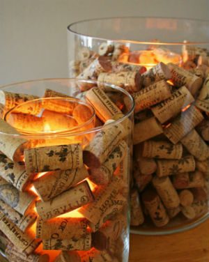 Такой подсвечник можно изготовить в считанные секунды, а как удачно он впишется в интерьер дома или квартиры. Для его изготовления понадобятся пробки, гелевая свеча, крупный стаканчик или ваза. В вазу насыпаем пробки, устанавливаем стаканчик с гелевой свечой, и заполняем пробками — боковые пространства.