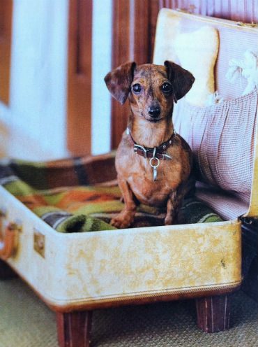 Чемодан может послужить вашему любимцу прекрасным местом отдыха, для этого дно чемодана лучше укрепить при помощи фанеры и прибить к его основанию изящные невысокие ножки.