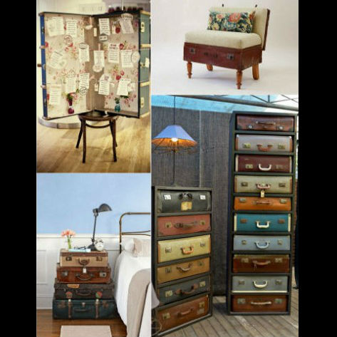Прекрасная идея использования чемоданов в виде ящичков для хранения вещей. Создается цельный каркас из дерева, с отсеками подходящими по ширине и длине чемоданов, после чего срезается крышка чемодана, и он устанавливается в подготовленный отсек.