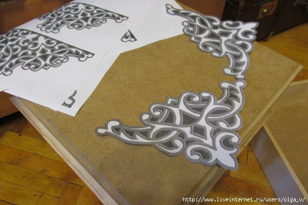 Распечатываем на принтере(лучше лазерном) задуманный шаблон росписи, вырезаем рисунок по внешнему контуру и наклеиваем на заготовку клеем ПВА.