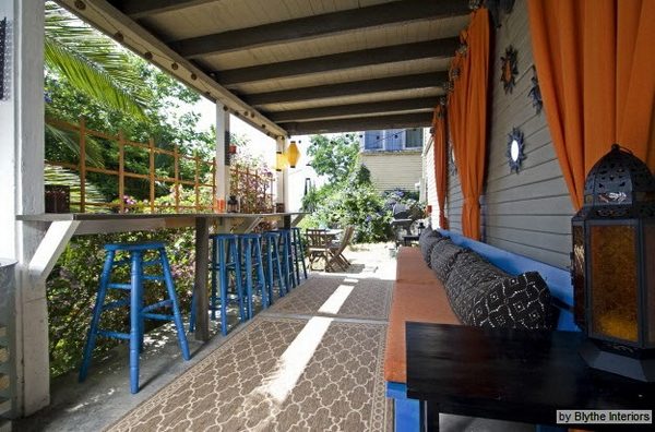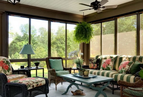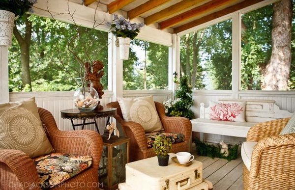 Большая часть стен веранды имеет окна, поэтому крупная мебель (шкафы, полки, этажерки) размещается у глухой стены. У окон или в центре размещают столик, кресла и диванчики. Чтобы сэкономить полезное место, можно сделать откидной столик, приделанный к подоконнику. Так как веранда – очень солнечное помещение, не помешает повесить на окна занавески, жалюзи или шторы из соломки.